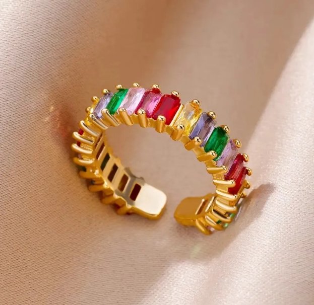 La bague Gabrielle est l’accessoire parfait pour celles qui aiment marier élégance et fantaisie. Conçue pour briller, elle se distingue par son sertissage « en ligne » de pierres synthétiques aux couleurs éclatantes (rubis, émeraude, améthyste et saphir), offrant un rendu digne de la haute joaillerie.