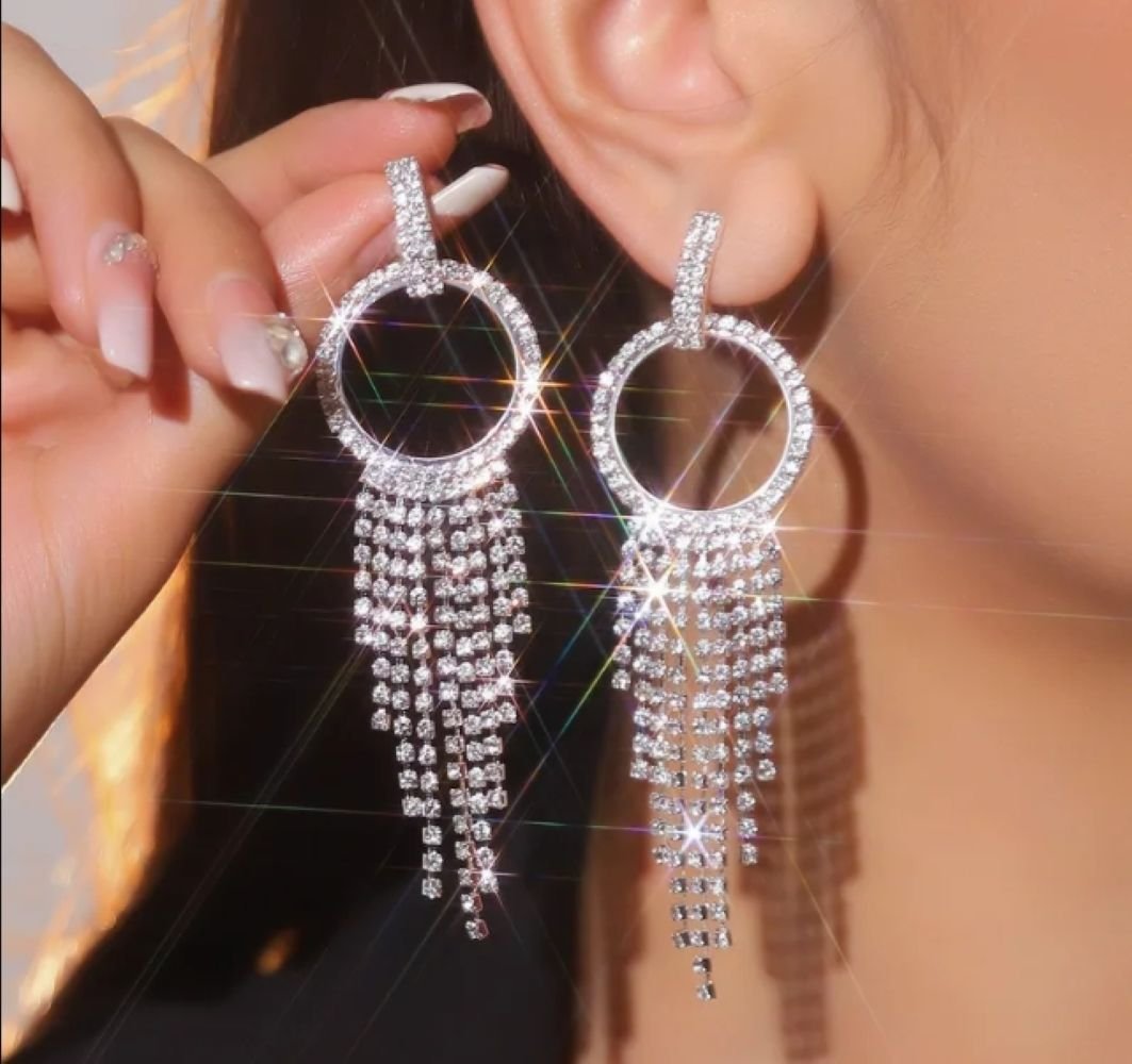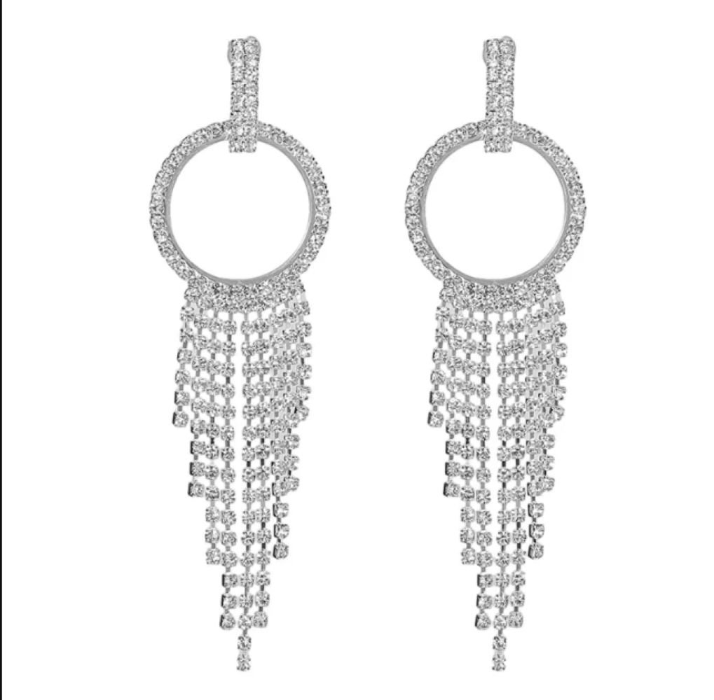 • Elles présentent un grand anneau ouvert entièrement pavé de pierres brillantes, à partir duquel s’échappent des rangées de chaînes ornées de cristaux, formant une magnifique cascade scintillante.