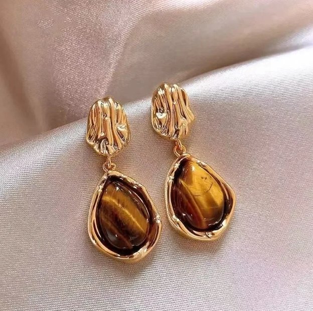 Laissez-vous séduire par l’allure vintage et résolument moderne des boucles d’oreilles Charlotte. Chaque pièce se compose d’un clou doré à la texture « fondue » et irrégulière, retenant une sublime goutte en pierre aux reflets chatoyants.