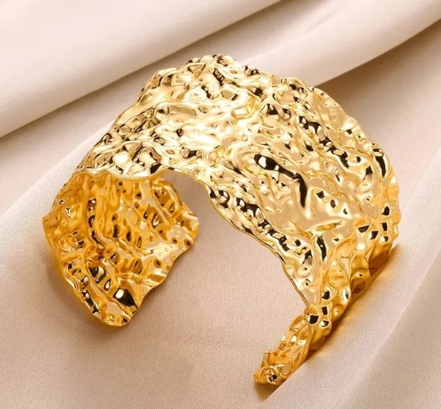 Design d’Artiste : Contrairement au martelage classique, ce bracelet présente une surface richement texturée et froissée qui reflète la tendance du « métal liquide ». Cette finition irrégulière maximise la capture de la lumière.